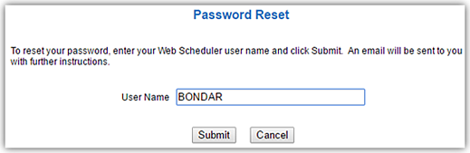 3. Click Submit. An email with “Web Scheduler Password Reset” in the subject line will be sent to the email address in your profile. Click the link in the message, or copy it into your browser, to access the Set New Password page in Web Scheduler.